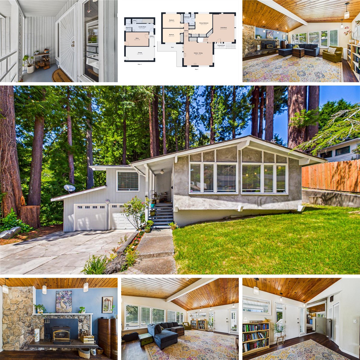 Against a backdrop of stunning redwoods, this 3-bedroom, 2-bath home blends warmth, light, and flexible living space. Interior highlights include vaulted wood-lined ceilings, a spacious living room with wood-burning insert, and a wall of windows that flood the space with natural light. A lower-level bonus room and bath expand your options for guests or work-from-home. Outside, enjoy a private deck and low-maintenance yard with a lush woodland vibe. Conveniently located near shopping, dining, and medical facilities. One-Year Home Warranty provided by Seller.