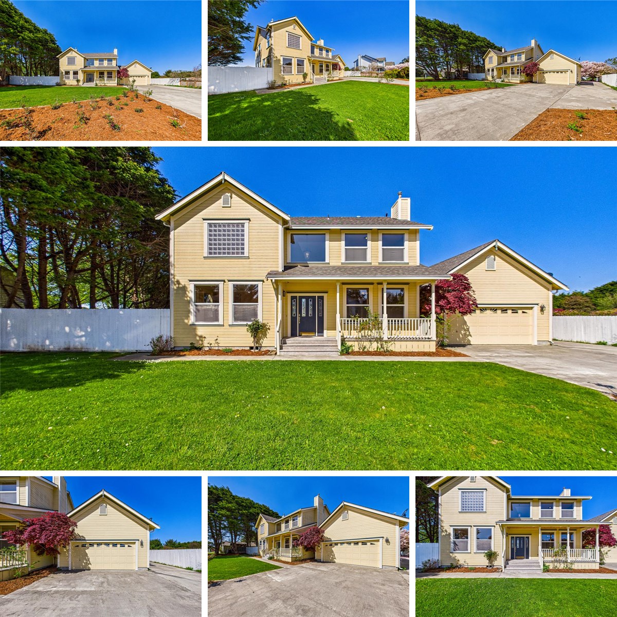 Upstairs has a large landing with views of the ocean; soaring ceilings in the primary bedroom with in-suite bathroom, two cedar lined walk-in closets, and ocean view; two additional bedrooms, one full bathroom, and storage closet. Oversized garage with built in shelving and a roll-up rear door that allows access to the backyard. Oversized parking on the north side of the home for backyard access, RV, trailer, or boat storage. Situated on half acre of flat, landscaped land and located within two blocks of the ocean, Mad River and a stone's throw from the Hammond Trail. Easy access to highway 101 and the airport makes this home close to everything, yet still private.